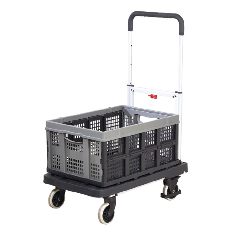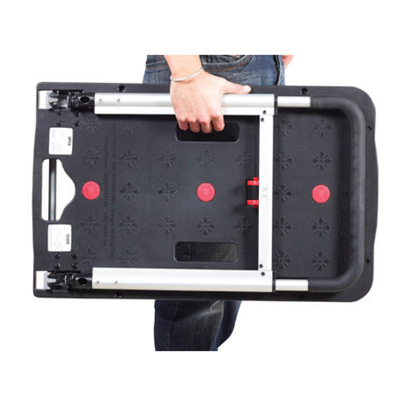 Foldaway platform trolley with telescopic handle, folding wheels and plastic platform with integral carry handles.